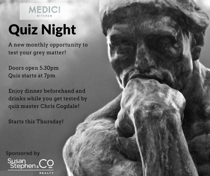 Monthly Quiz night, Sponsored by Susan Stephen & Co Realty, hosted by Chris Cogdale and located at Medici Kitchen in Martinborough. Featuring a special menu,…